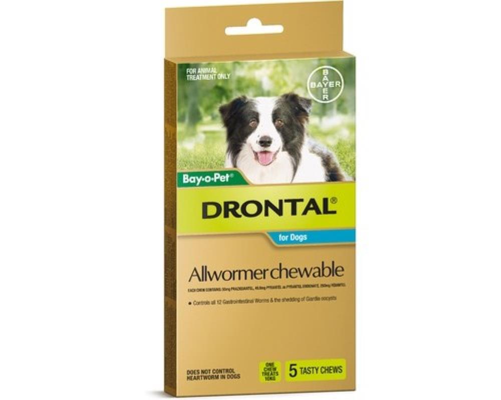 Drontal Dog Wormer is a trusted solution for maintaining your dog's health. Each pack contains five palatable chews, conveniently designed for ease of administration. Protect your furry friend from harmful intestinal worms with this effective treatment.