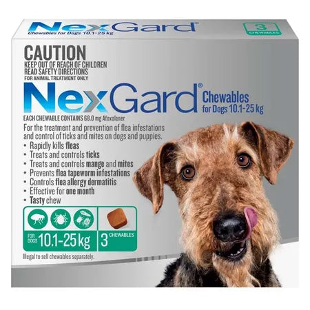Nexgard Chew is a highly effective flea and tick treatment specifically designed for large dogs weighing between 10.1 to 25kg. This once-a-month chewable tablet not only tackles current infestations but also prevents future ones, ensuring your furry friend stays comfortable and healthy.