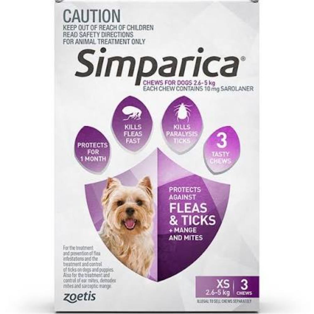 Simparica for dogs is an effective flea and tick treatment designed for dogs weighing between 2.6 to 5 kg. This purple package contains three doses, providing a reliable solution to keep your furry friend protected from pesky parasites.
