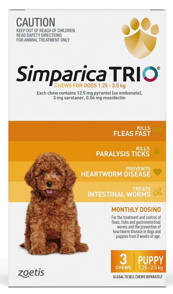 Simparica Trio is your all-in-one solution for your small dog’s health, designed specifically for dogs weighing 1.3 to 2.5 kg. This convenient three-pack provides a comprehensive approach to parasite protection, ensuring your furry friend stays healthy and happy.