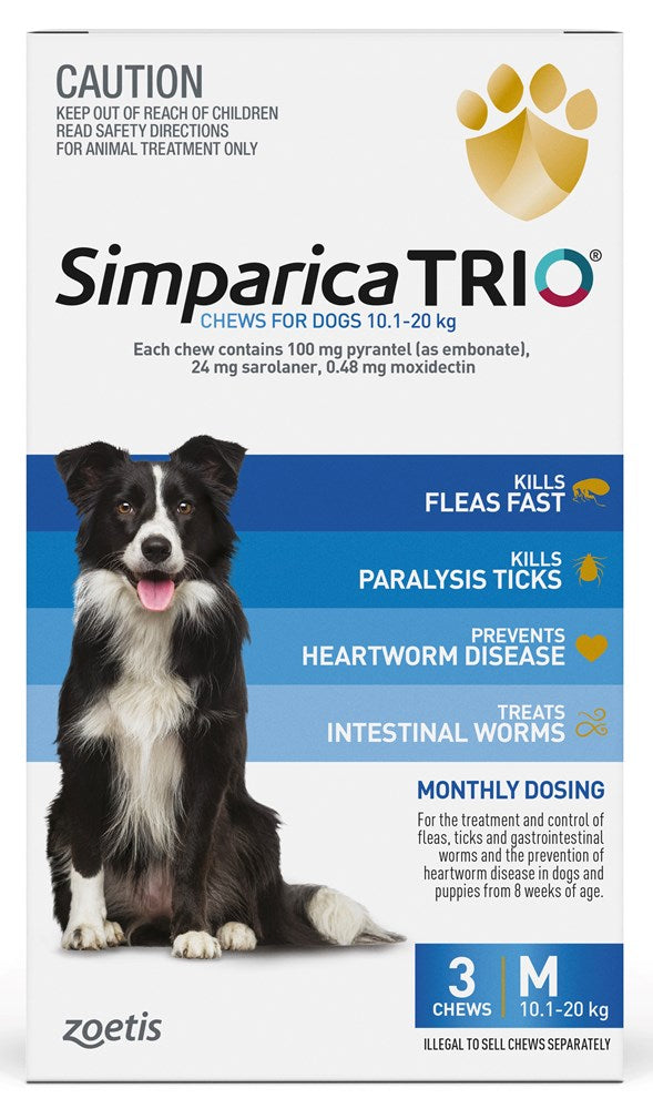 Simparica Trio is an effective and comprehensive treatment designed for dogs weighing between 10.1 to 20kg. This innovative solution tackles fleas, ticks, heartworm, and intestinal worms all in one easy-to-administer chewable tablet.